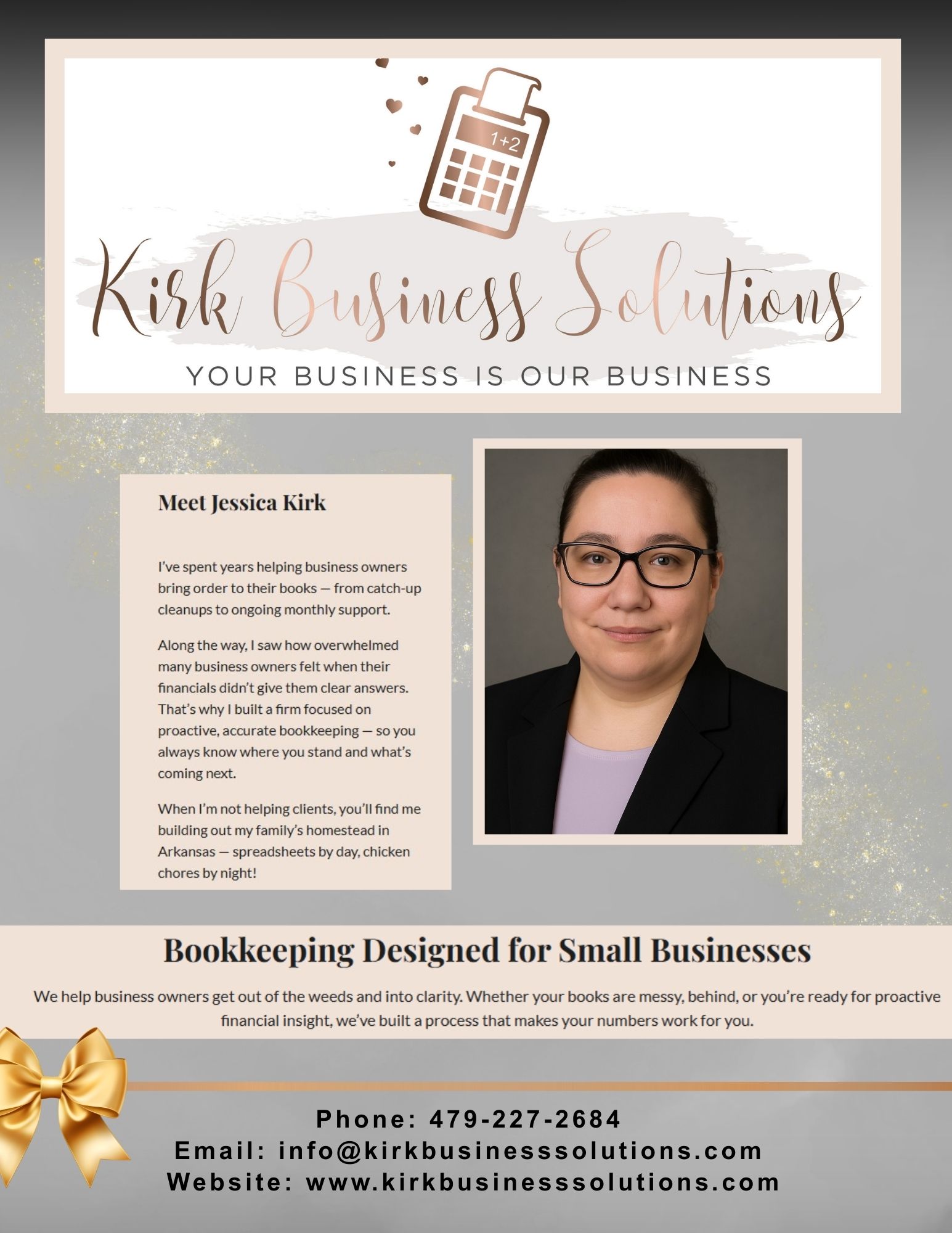 Kirk Business Solutions provides professional bookkeeping services for small business owners in Arkansas and nationwide. We help business owners gain clarity in their financials, understand their numbers, and make confident decisions — without surprise bills or confusing reports. Services include QuickBooks Online setup, payroll setup and management, cleanup projects, monthly bookkeeping, and detailed financial reporting.